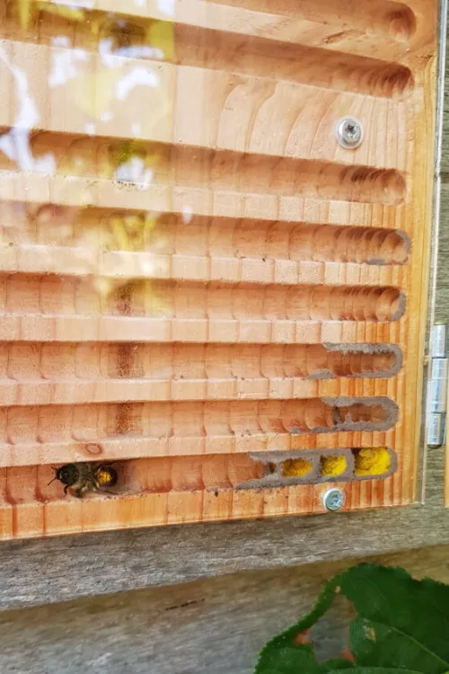 Het observatiehuisje is zo ontworpen dat je alles van dichtbij kunt volgen. Je ziet hoe vrouwtjesbijen stuifmeel verzamelen, eitjes leggen en de gangen afsluiten met een wandje van klei. Dit is niet alleen prachtig om te zien, maar biedt ook een unieke kans om meer te leren over de cyclus van metselbijen en hun cruciale rol in het ecosysteem.